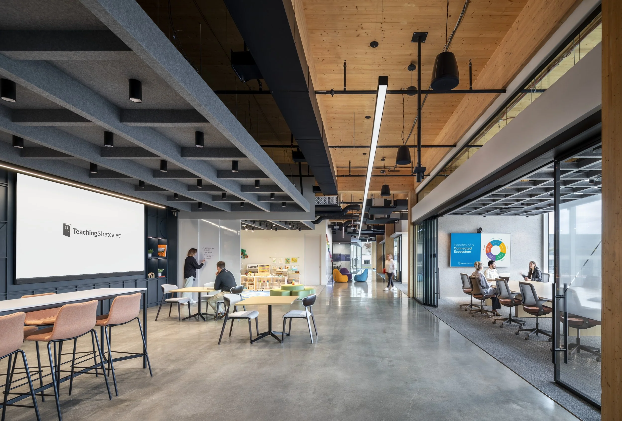 Teaching Strategies’ relocation to a first-generation mass timber commercial office in DC, we transformed a reduced footprint into a highly functional, brand-forward workplace. Soaring 15’ ceilings and sweeping views set the tone for a flexible space featuring a product “classroom lab,” tech-enabled broadcasting capabilities, and multi-use zones for internal events and nationwide team engagement. The result is a warm, modern environment that supports both everyday work and immersive brand storytelling.